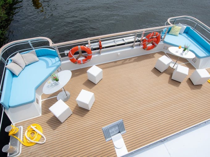 The Solarwaterworld AG pier is located directly behind the nhow Hotel Berlin at Stralauer Allee 3. For the simplest and most accurate navigation, enter the following three words into the What3Words app to be guided with square-meter precision: abbilden knien förderte. From the Oberbaum Bridge, it is approximately 150 meters to the pier. With the East Side Gallery behind you, walk along Stralauer Allee toward the nhow Hotel. Keep to the right and look out for the blue Solarwaterworld flag.
