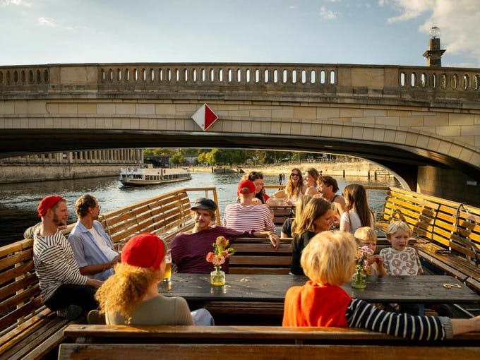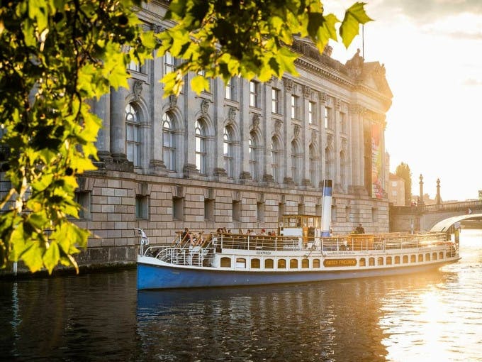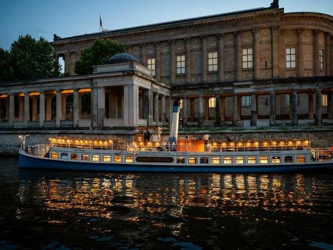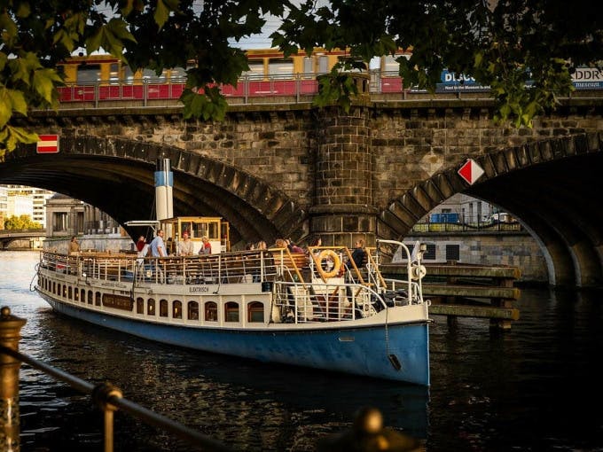 This popular tour takes you to both the charming nooks and the pulsating heart of the capital. Aboard the city's oldest vessel, nearly 140 years old and now powered by silent electric propulsion, you can settle comfortably either on the expansive upper deck or in one of the cosy wood-panelled lounges. Immerseyourself in Berlin's rich history and contemporary vibe in equal parts. You'll glide past the innovative Holzmarkt 25 district, the iconic Oberbaum Bridge, the Badeschiff, and the Hoppetossee – all modern landmarks of Berlin nightlife. At the Insel der Jugend (Island of Youth) near Treptower Park, the ship turns around and sails directly into the sunset back towards the city.