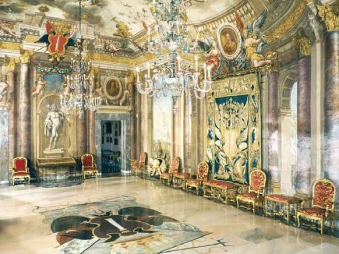 The gallery was created to celebrate the Christian victory at the Battle of Lepanto (1571), with Commander Marcantonio II Colonna depicted throughout the Great Hall and the Room of the Battle Column.