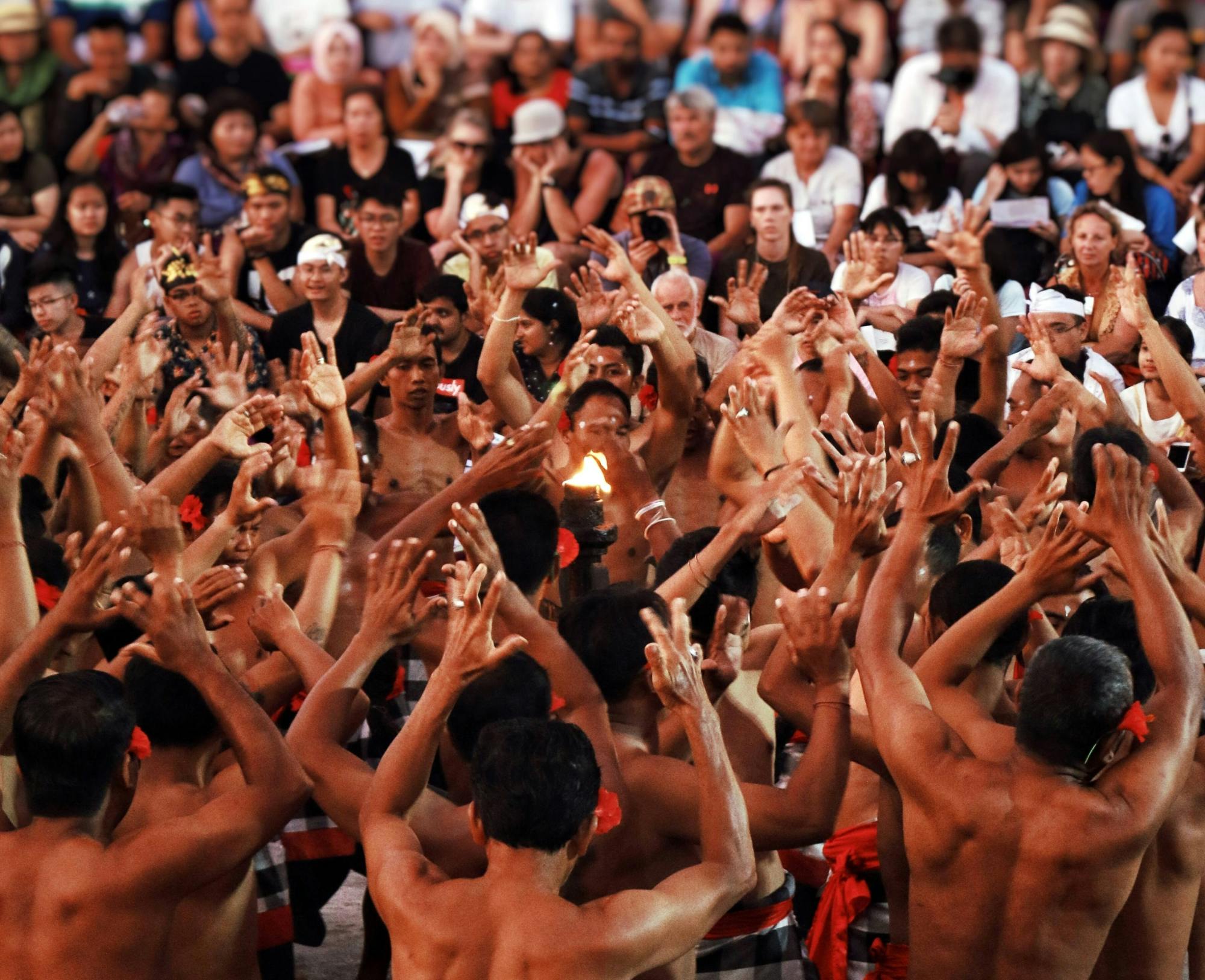 Sedan, när solen sjunker mot horisonten, bjuds du på en kecak-dansshow. Det är en blandning av kraftfull sång, detaljerade kostymer och komplexa rörelser som berättar om en berättelse från Ramayana, en gammal sanskrittext. Aporna är alla en del av historien – håll utkik efter Hanuman, den vita apkrigaren.